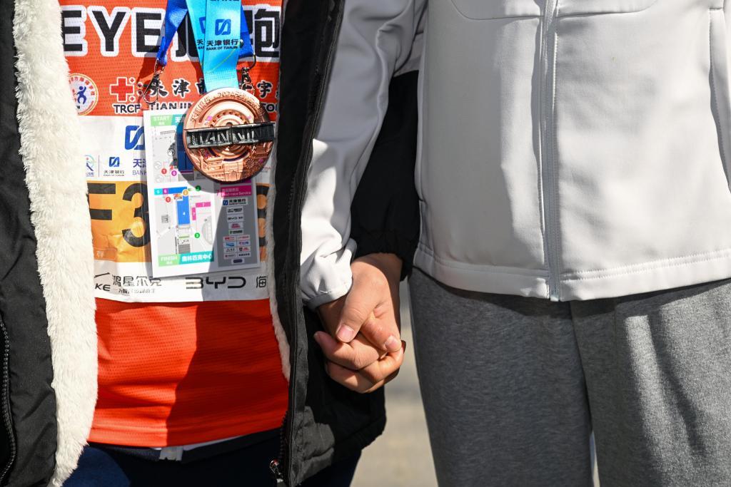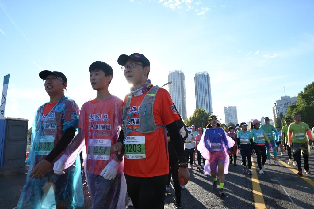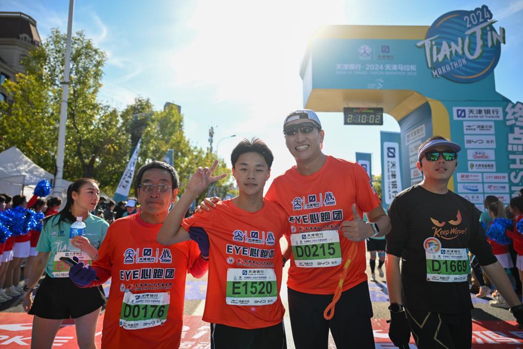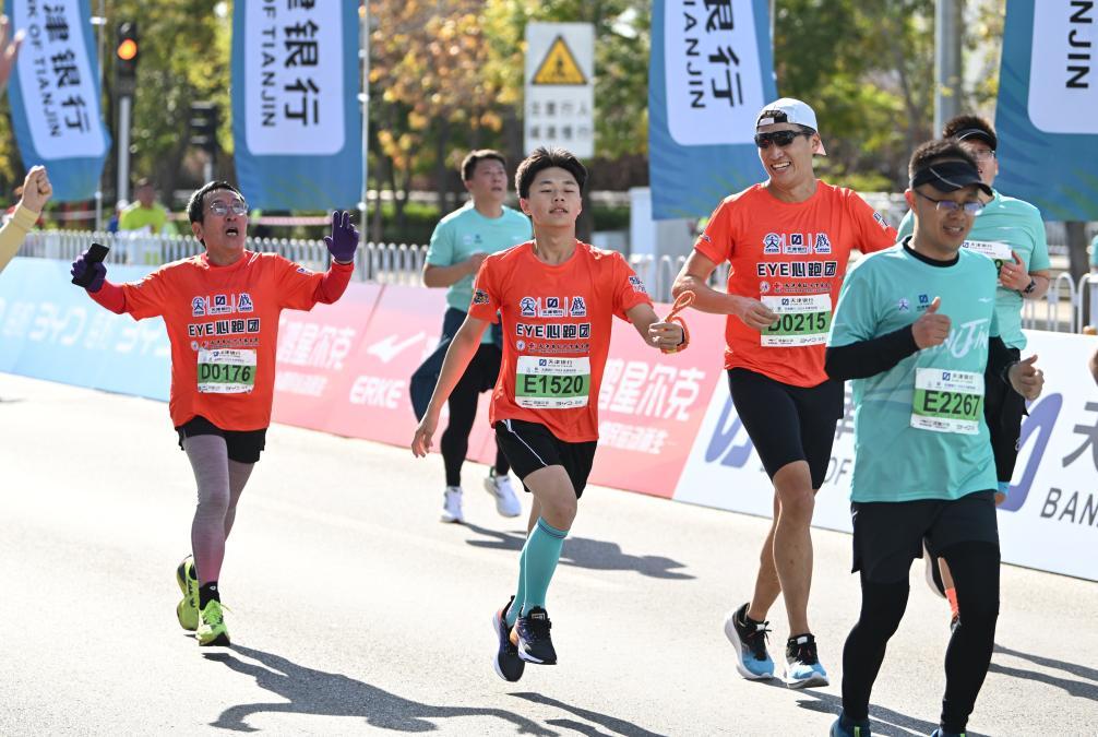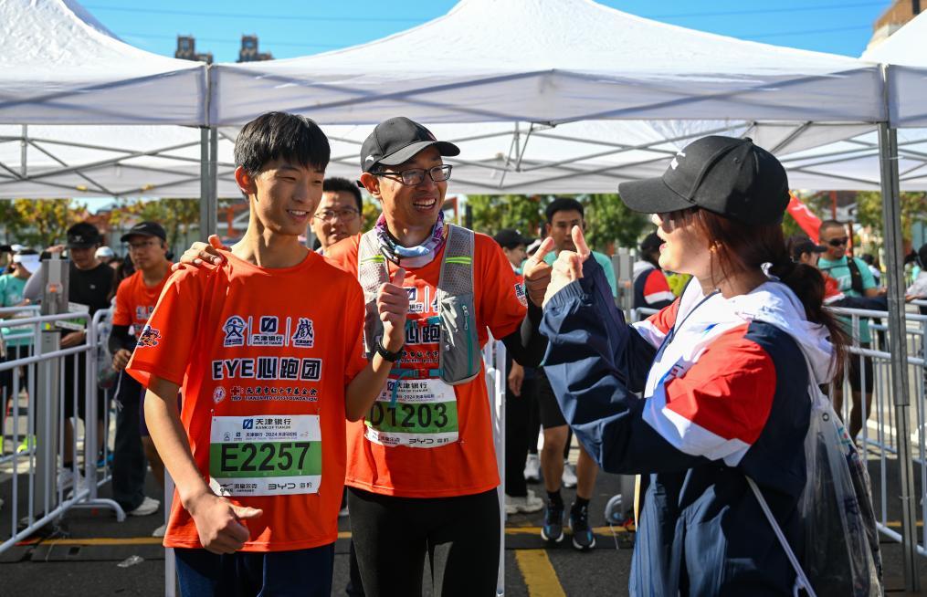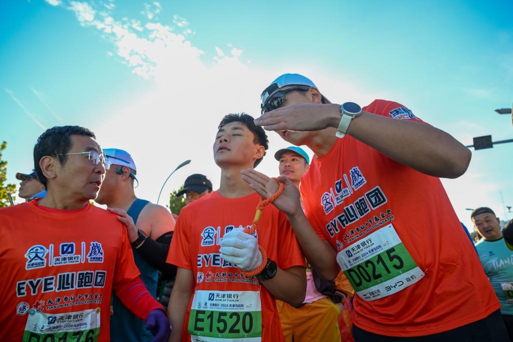 參加2024天津馬拉松的“EYE心跑團”由天津市紅十字基金會組建,跑團6名參賽者是天津市視力障礙學校在校生和畢業生,14名志愿陪跑員同程伴跑。