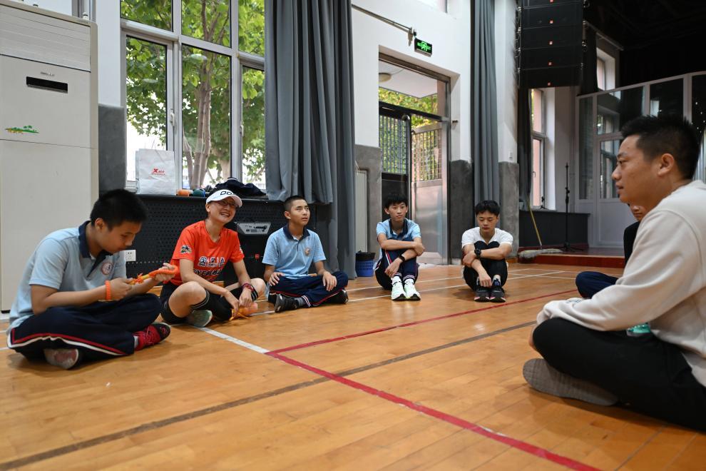 陪跑員帶領“EYE心跑團”選手李澤洲在天津市視力障礙學校訓練(10月16日攝)。新華社記者 孫凡越 攝