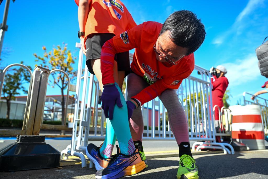 陪跑員馬長軍(右)幫助“EYE心跑團”選手李澤洲拉伸肌肉(10月20日攝)。新華社記者 孫凡越 攝