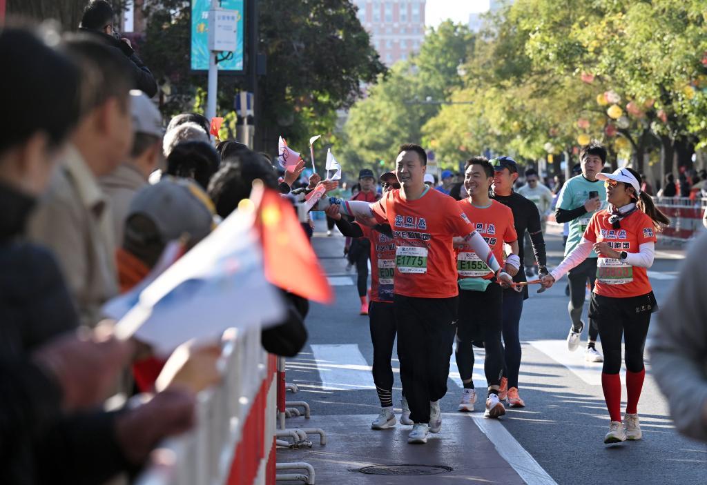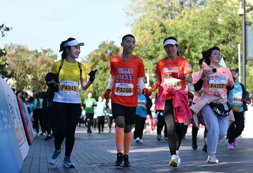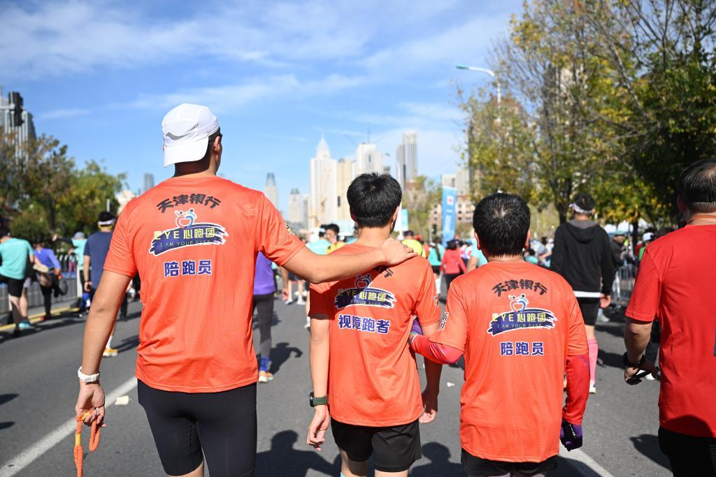 10月20日,2024天津馬拉松鳴槍開跑。今年的天津馬拉松賽場首次出現視障選手跑團。在愛心陪跑員的引導下,多名視障青年完成了人生中首次馬拉松賽。