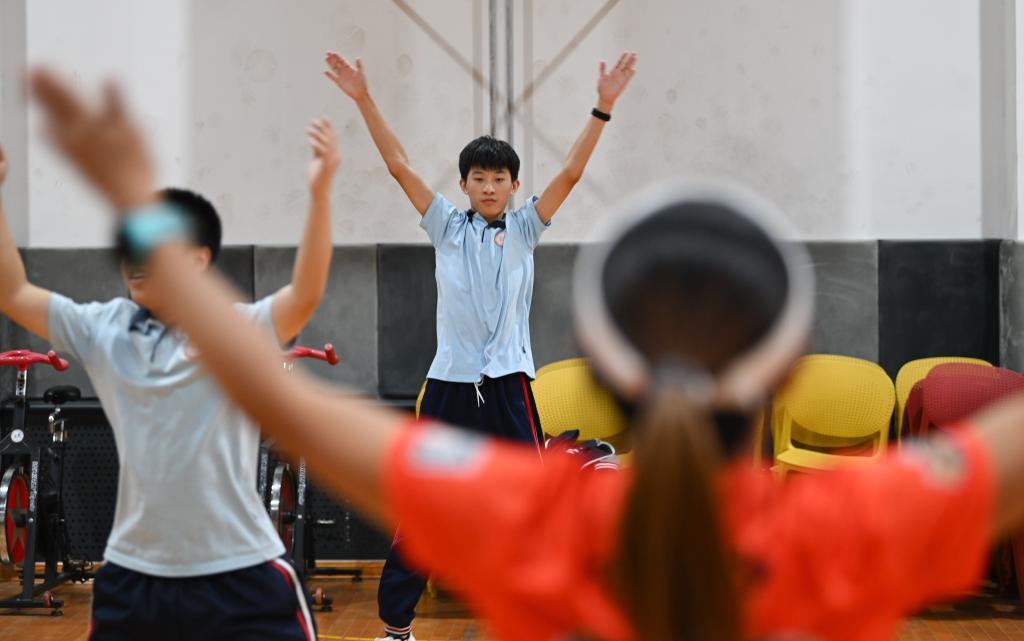 “EYE心跑團”選手苑嘉樂(左)與陪跑員唐麗蕓在天津市視力障礙學校進行賽前訓練(10月16日攝)。新華社記者 孫凡越 攝
