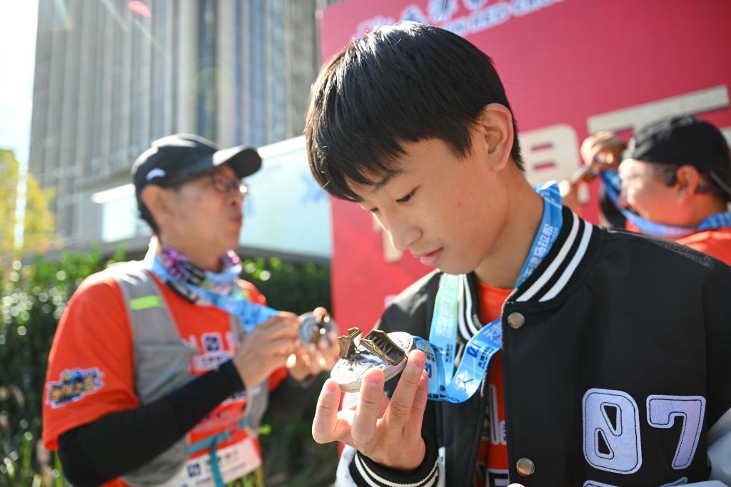 “EYE心跑團”選手丁思琦賽后欣賞完賽獎牌(10月20日攝)。新華社記者 孫凡越 攝