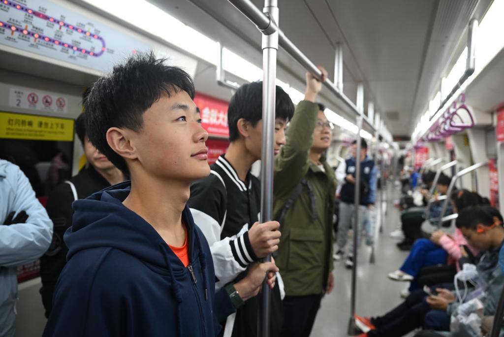 “EYE心跑團”選手李澤洲(左一)、丁思琦(左二)在輔導教師趙鴻祥的帶領下搭乘地鐵前往賽場(10月20日攝)。新華社記者 孫凡越 攝