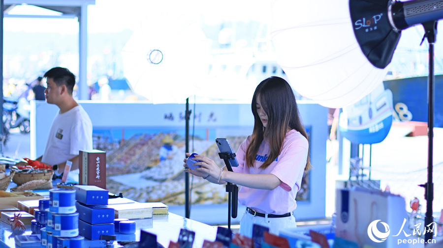 網絡主播正在推介當地海鮮加工產品。人民網 李昌乾攝