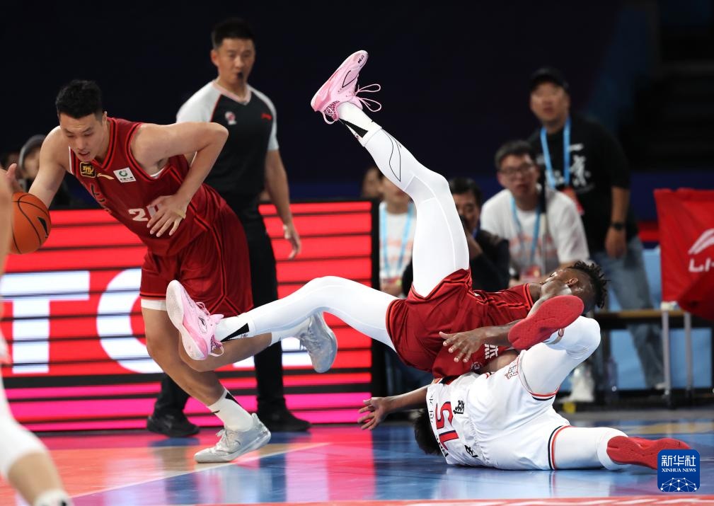 10月20日,北京北汽隊球員杰曼(右上)和廣州朗肽海本隊球員佟佳俊拼搶時雙雙倒地。
