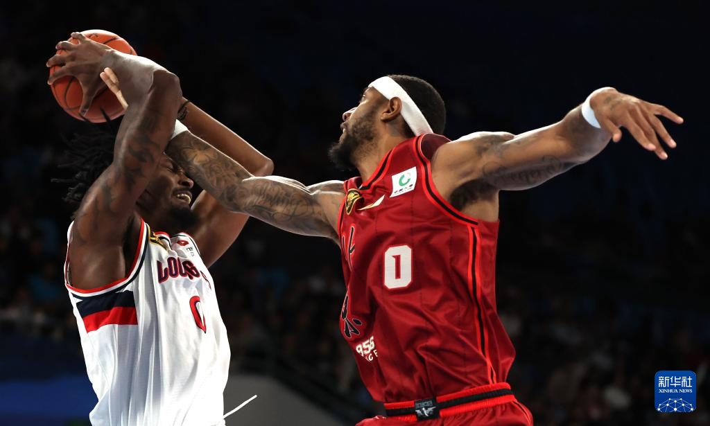 10月20日,北京北汽隊球員奧莫特(右)與廣州朗肽海本隊球員克勞福德拼搶。