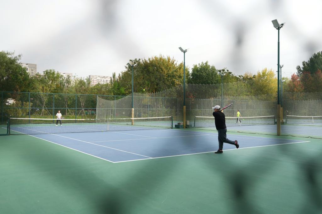 10月16日,在北京回龍觀體育文化公園的網球場,幾位愛好者在打網球。新華社記者 鞠煥宗 攝