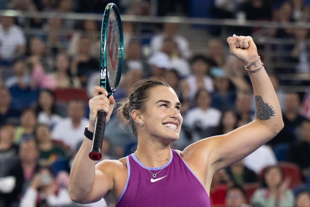 10月13日,薩巴倫卡在獲勝后慶祝。當日,在武漢網球公開賽女單決賽中,薩巴倫卡戰勝鄭欽文,奪得冠軍。新華社記者 肖藝九 攝