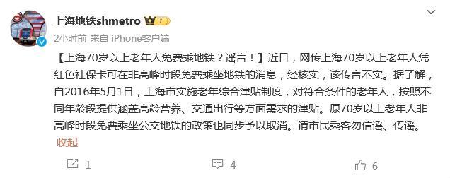 @上海地鐵shmetro 表示,據了解,自2016年5月1日起,上海市實施老年綜合津貼制度,對符合條件的老年人,按照不同年齡段提供涵蓋高齡營養、交通出行等方面需求的津貼。原70歲以上老年人非高峰時段免費乘坐公交地鐵的政策也同步予以取消。請市民乘客勿信謠、傳謠。