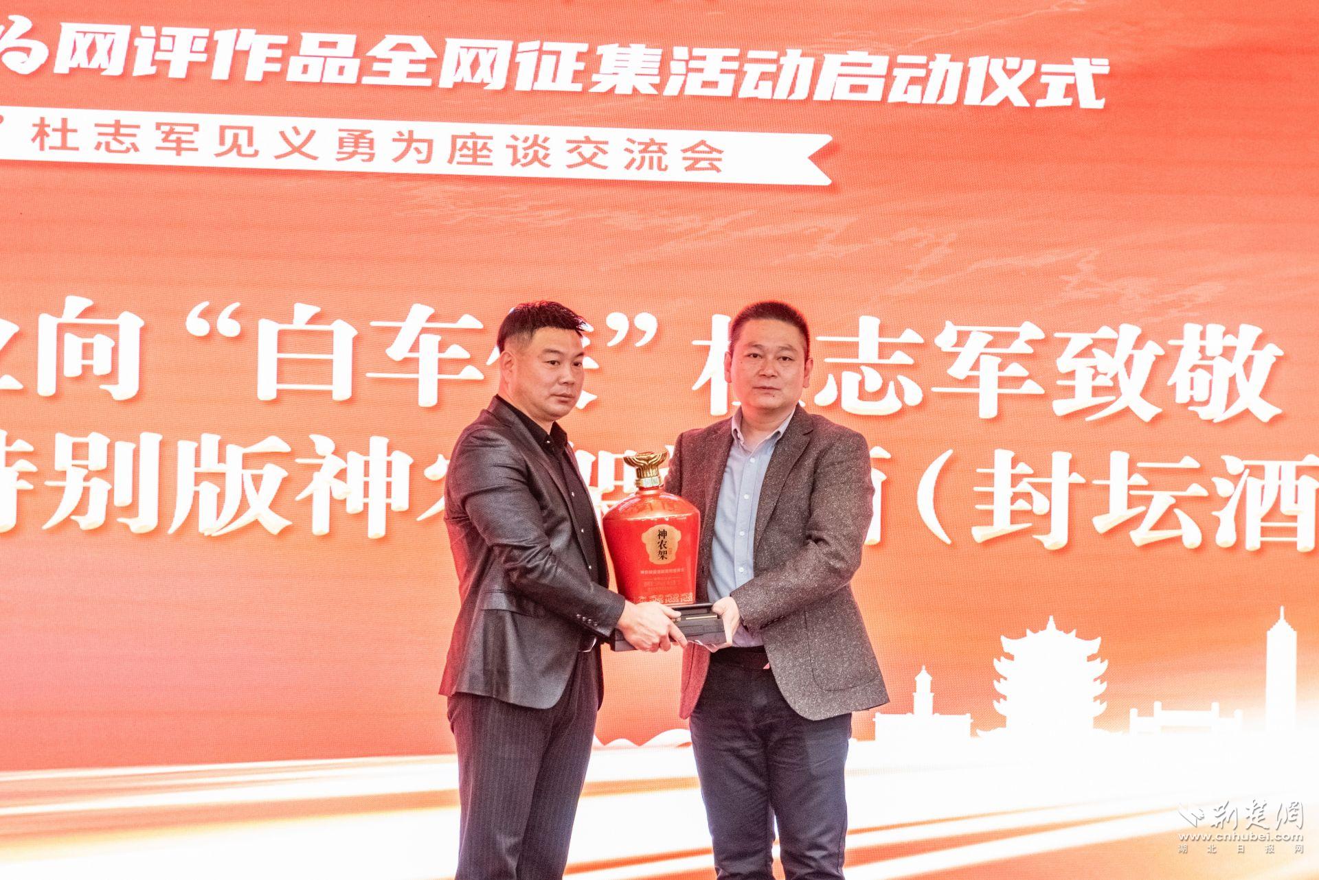 勁牌神農(nóng)架酒業(yè)向“白車俠”杜志軍贈送“荊楚勇士”特別版神農(nóng)架醬酒。蘇航 攝
