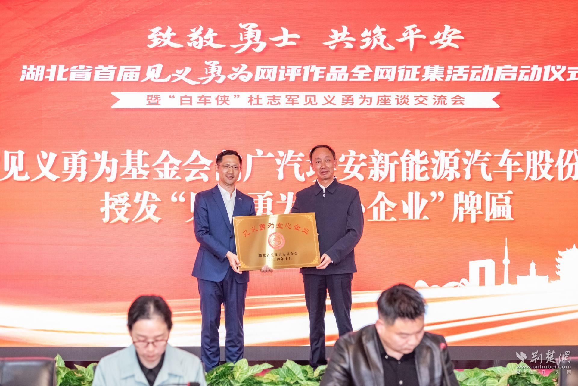省見義勇為基金會向廣汽埃安新能源汽車股份有限公司授發(fā)“見義勇為愛心企業(yè)”牌匾。蘇航 攝