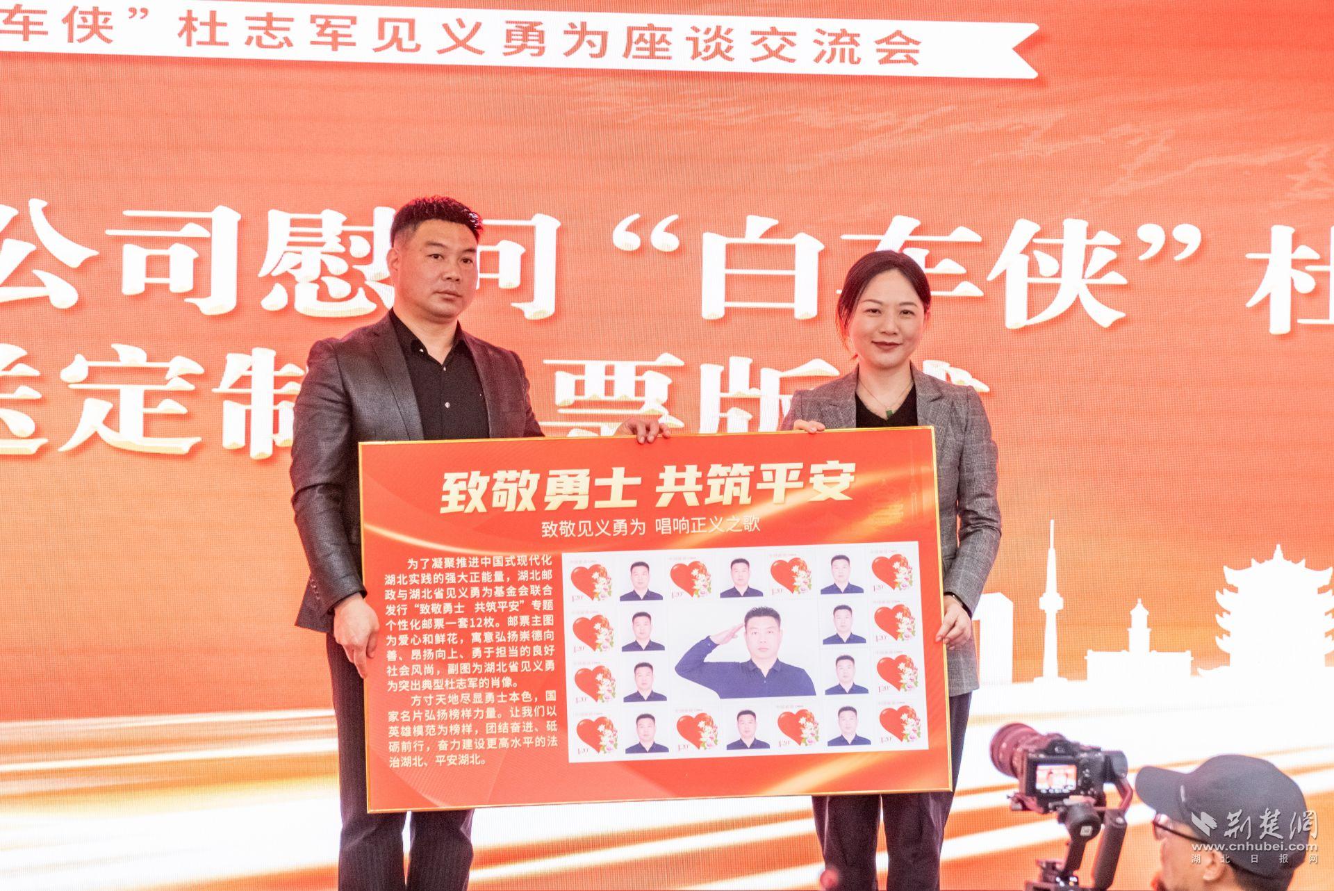 湖北省郵政分公司慰問“白車俠”杜志軍并贈送定制郵票版式。蘇航 攝