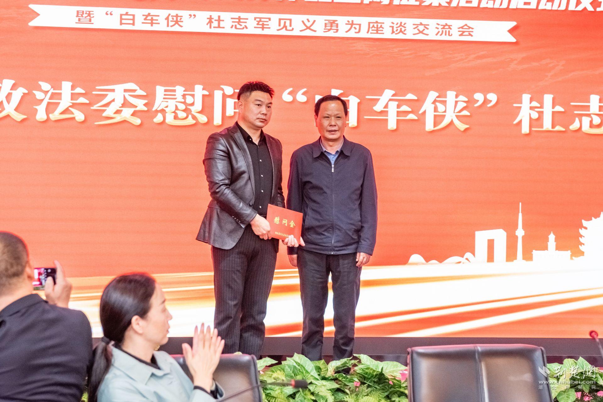 活動現(xiàn)場,省委政法委、湖北省郵政分公司、湖北銀行、勁牌神農(nóng)架酒業(yè)分別向杜志軍發(fā)放了慰問金和慰問品。省見義勇為基金會向廣汽埃安新能源汽車股份有限公司授發(fā)“見義勇為愛心企業(yè)”牌匾。
