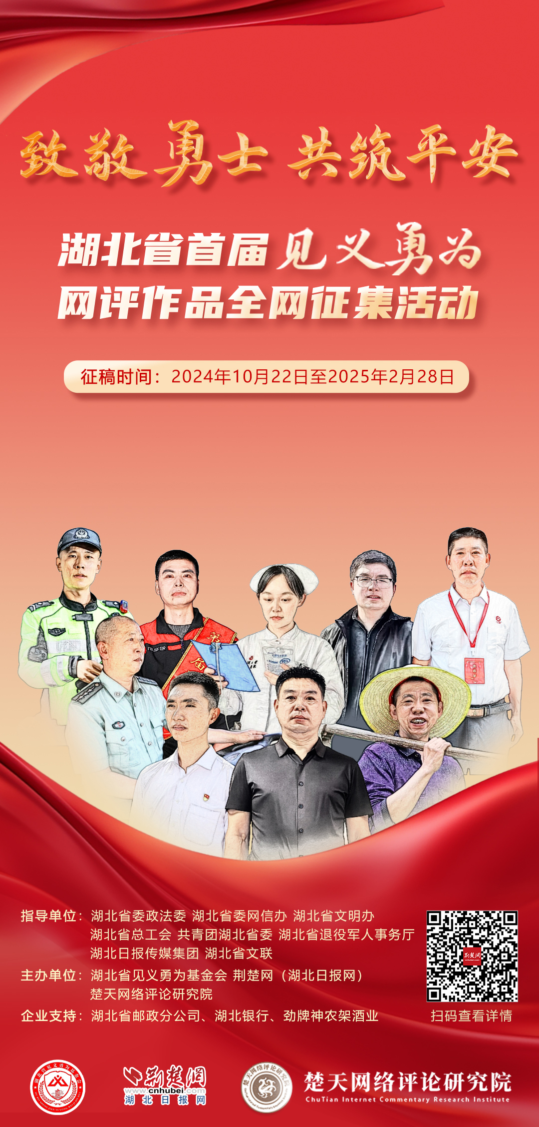 講好英雄故事,汲取榜樣力量。湖北日報傳媒集團(tuán)有關(guān)負(fù)責(zé)人介紹,湖北省首屆見義勇為網(wǎng)評作品全網(wǎng)征集活動以“致敬勇士 共筑平安”為主題,共征集網(wǎng)評類和故事類兩類作品,分為征集初評、現(xiàn)場調(diào)研、專家評審、宣講傳播、結(jié)果公示、頒獎座談等階段。活動時間持續(xù)至明年2月,設(shè)有一等獎2名、二等獎5名、三等獎10名、優(yōu)秀獎30名和組織獎5名。荊楚網(wǎng)東湖評論欄目將開設(shè)見義勇為網(wǎng)評作品主題專欄,及時刊發(fā)優(yōu)秀作品。