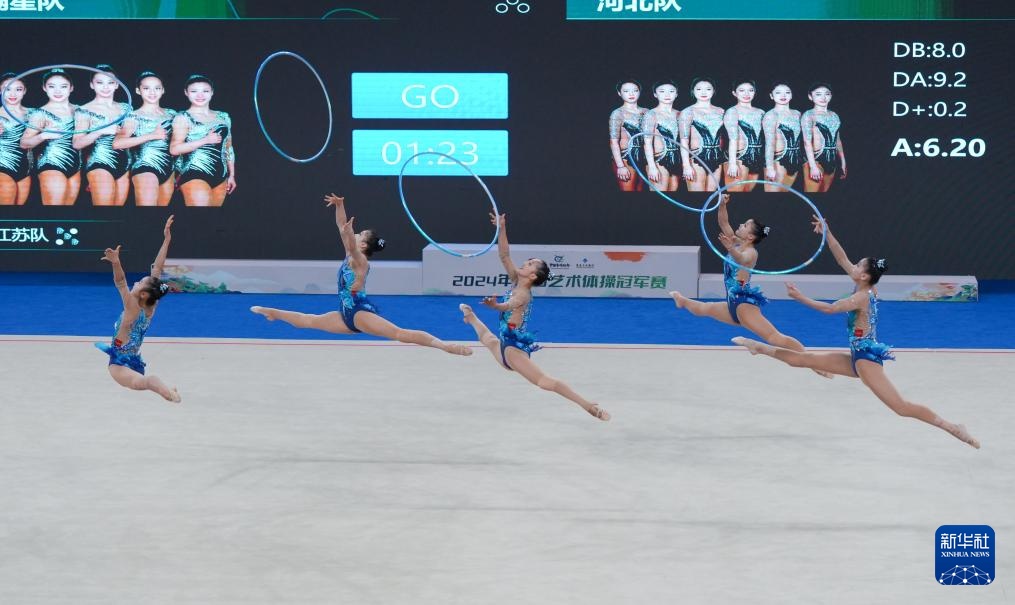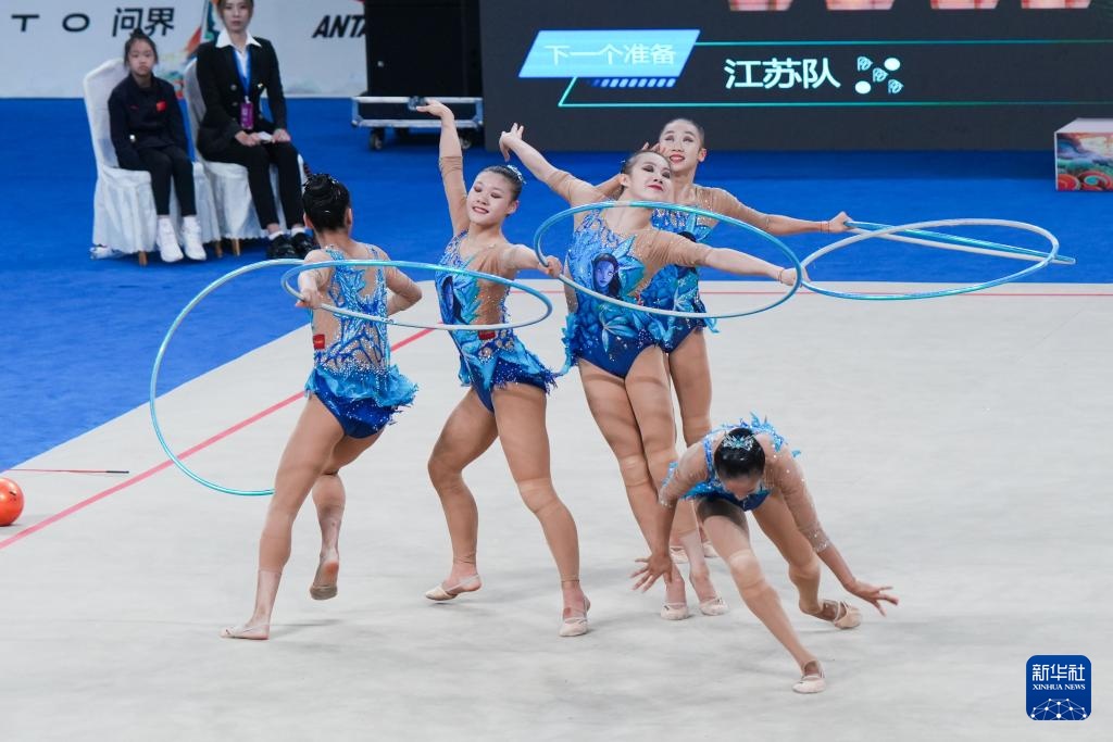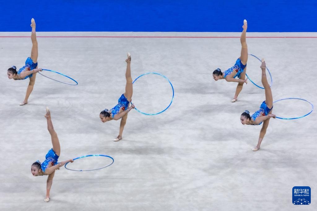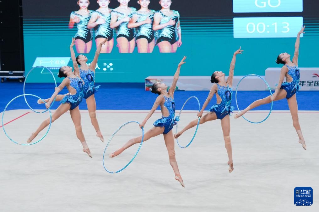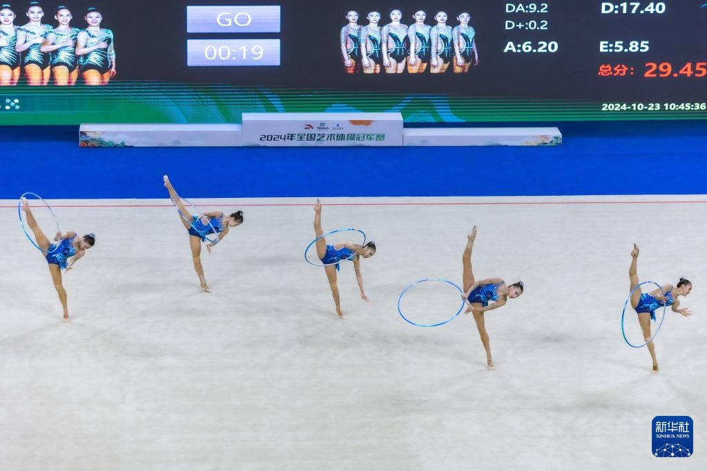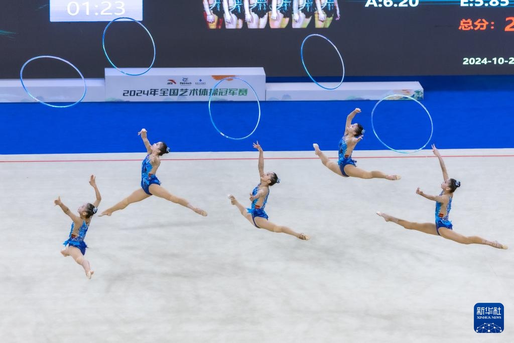 當日,2024年全國藝術體操冠軍賽成年集體5圈決賽在重慶舉行,遼寧金滿星隊以32.45分的總成績獲得冠軍。