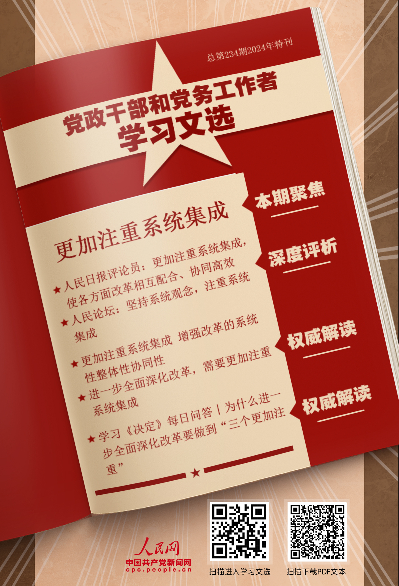 摘要:黨的二十屆三中全會《決定》提出“更加注重系統集成”,將其作為進一步全面深化改革的指導思想的重要內容。注重系統集成,是新時代以來我們黨全面深化改革的重要思想方法和工作方法。更加注重系統集成,彰顯了運用辯證唯物主義世界觀和方法論進一步全面深化改革的高度自覺。