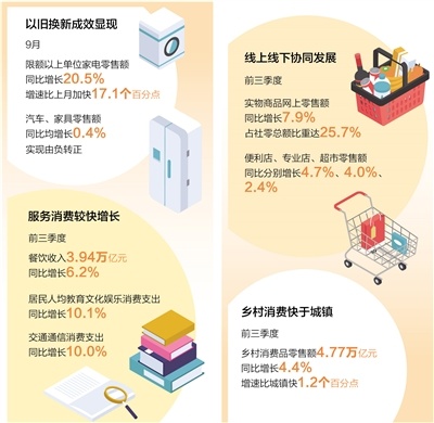以舊換新成效顯現。據國家統計局數據,9月份商品零售額3.67萬億元,同比增長3.3%,增速比上月加快1.4個百分點。限額以上單位家電零售額同比增長20.5%,增速比上月加快17.1個百分點;汽車、家具零售額同比均增長0.4%,實現由負轉正。