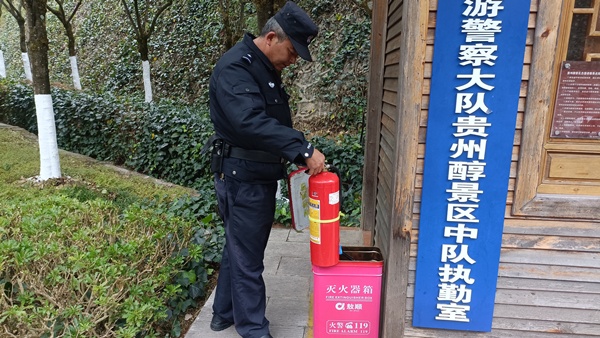 方勝在執(zhí)勤檢查滅火器。(受訪者供圖)