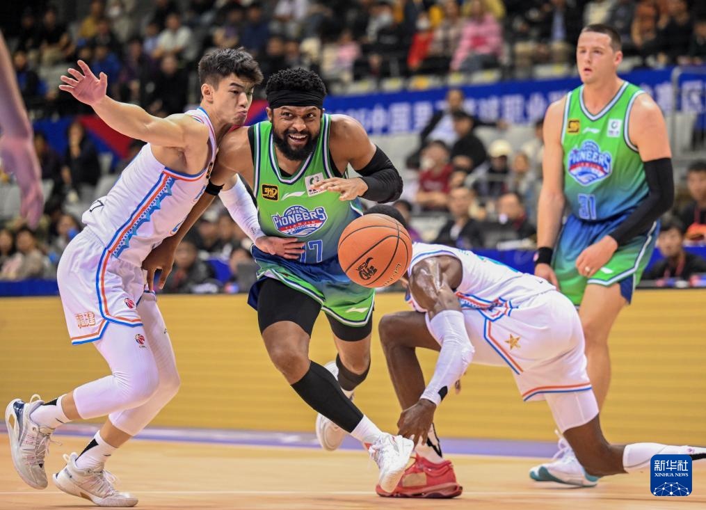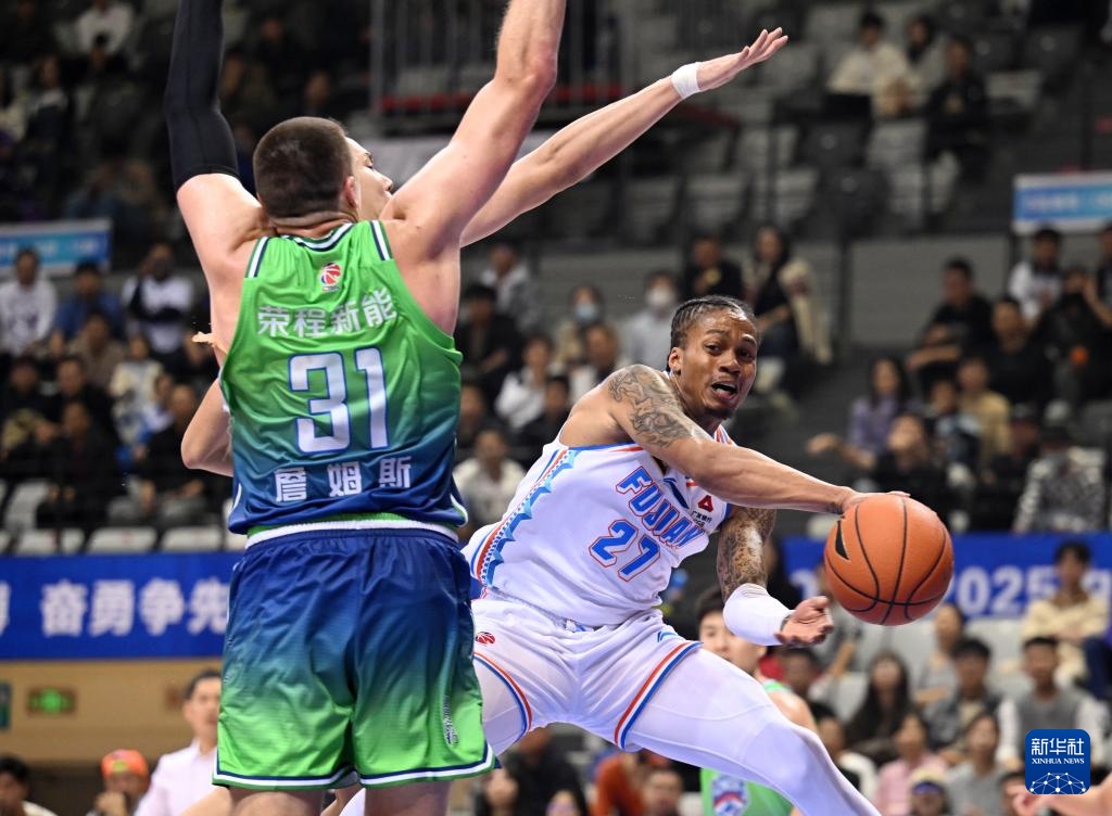 10月25日,福建晉江文旅隊(duì)球員貝利(右)在比賽中防守天津先行者隊(duì)球員詹姆斯。