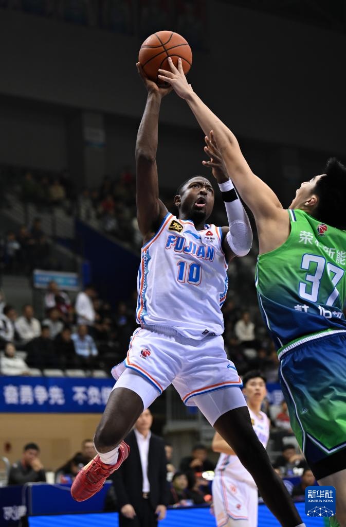 10月25日,福建晉江文旅隊(duì)球員坎普(左)在比賽中投籃。