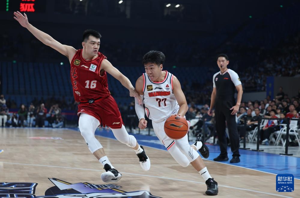 10月25日,廣東東陽光隊球員王少杰(中)在比賽中帶球突破。