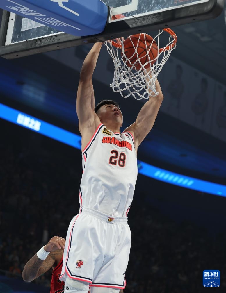 10月25日,廣東東陽光隊球員王少杰在比賽中扣籃。