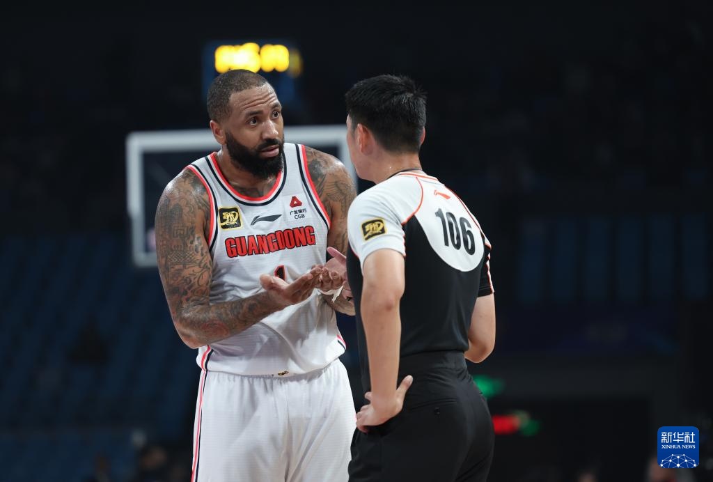 10月25日,廣東東陽光隊球員吉倫沃特(左)在比賽中與裁判交流。