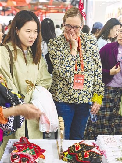 美國學者麗莎(右)在長江非遺大展上為荊楚非遺著迷。
