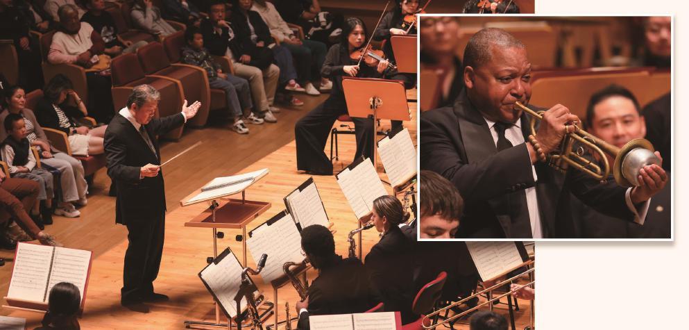 爵士小號大師溫頓·馬薩利斯帶著他的爵士樂團,同余隆率領(lǐng)的上海交響樂團,在上海交響音樂廳共同演繹第四交響曲《叢林》。 制圖:李潔 均文匯報記者 葉辰亮攝