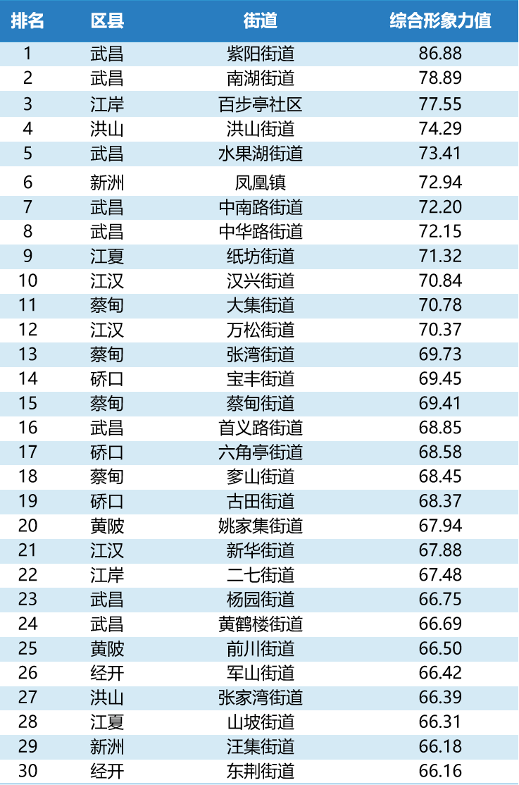 從各區(qū)上榜TOP30的情況來看,本期武昌區(qū)表現(xiàn)亮眼,有8個街道上榜,包括紫陽街道、南湖街道、水果湖街道、中南路街道、中華路街道、首義路街道、楊園街道與黃鶴樓街道。蔡甸區(qū)位列第二,有4個街道上榜,包括大集街道、張灣街道、蔡甸街道與奓山街道。江漢區(qū)與硚口區(qū)各有3個街道上榜,并列第三。其中江漢區(qū)包括漢興街道、萬松街道與新華街道;硚口區(qū)包括寶豐街道、六角亭街道與古田街道。洪山區(qū)、黃陂區(qū)、江岸區(qū)、江夏區(qū)、經(jīng)開區(qū)、新洲區(qū)各有2個街道上榜。其中洪山區(qū)包括洪山街道、張家灣街道;黃陂區(qū)包括姚家集街道、前川街道;江岸區(qū)包括百步亭社區(qū)、二七街道;江夏區(qū)包括紙坊街道、山坡街道;經(jīng)開區(qū)包括軍山街道、東荊街道;新洲區(qū)包括鳳凰鎮(zhèn)與汪集街道。