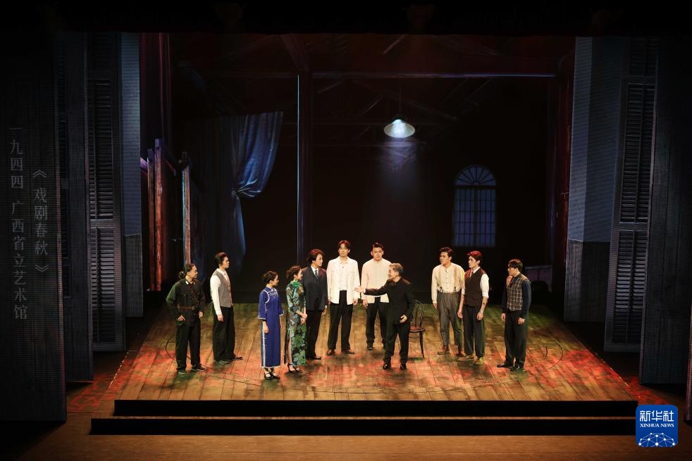 10月26日,在廣西省立藝術(shù)館,演員表演話劇《戲劇春秋》。