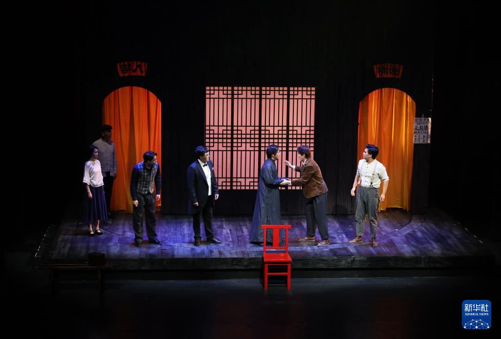 10月26日,在廣西省立藝術(shù)館,演員表演短劇《劃破長夜的燈》。