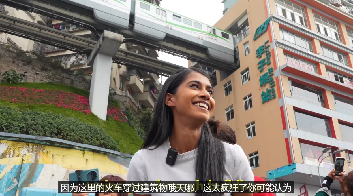 外國游客被重慶李子壩輕軌穿樓所震撼。