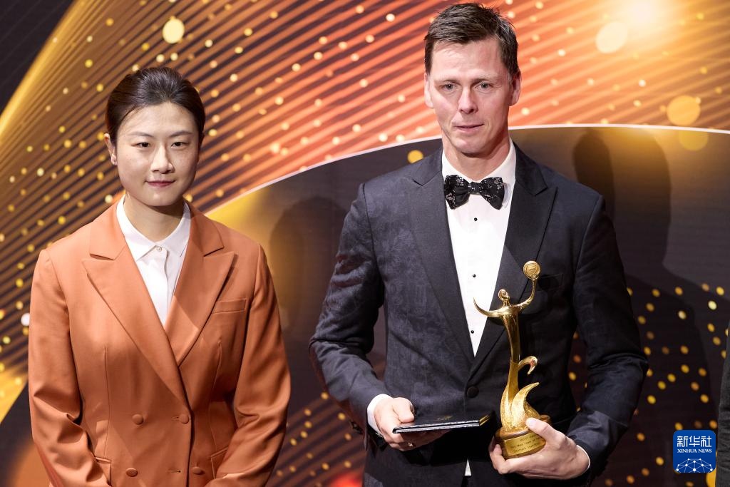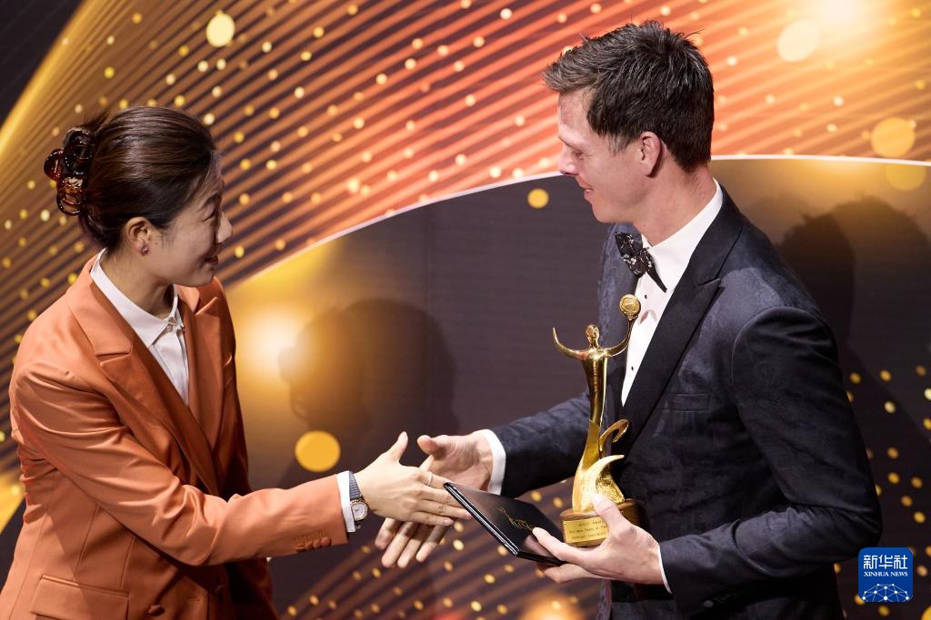 10月30日,中國乒乓球大滿貫得主、亞奧理事會運動員委員會主席丁寧(左)在頒獎典禮上為丹麥手球運動員漢斯·林貝爾頒獎。漢斯·林貝爾代表丹麥男子手球隊領取巴黎奧運會最佳男子團隊獎。