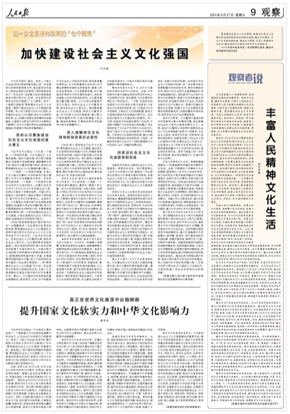 文化是凝聚人心的精神紐帶,也是增進(jìn)民生福祉的關(guān)鍵因素。推動(dòng)文化發(fā)展、建設(shè)文化強(qiáng)國(guó),從根本上說(shuō)就是為了更好滿足人民日益增長(zhǎng)的精神文化生活需要,不斷豐富人民精神世界、增強(qiáng)人民精神力量。聚焦建設(shè)社會(huì)主義文化強(qiáng)國(guó),“豐富人民精神文化生活”是其中的重要內(nèi)容。新征程上,實(shí)現(xiàn)進(jìn)一步全面深化改革文化領(lǐng)域目標(biāo)任務(wù),就要深入學(xué)習(xí)貫徹習(xí)近平文化思想,以高質(zhì)量文化供給增強(qiáng)人民群眾的文化獲得感、幸福感,讓人民群眾的精神文化生活更加豐富多彩。【全文】