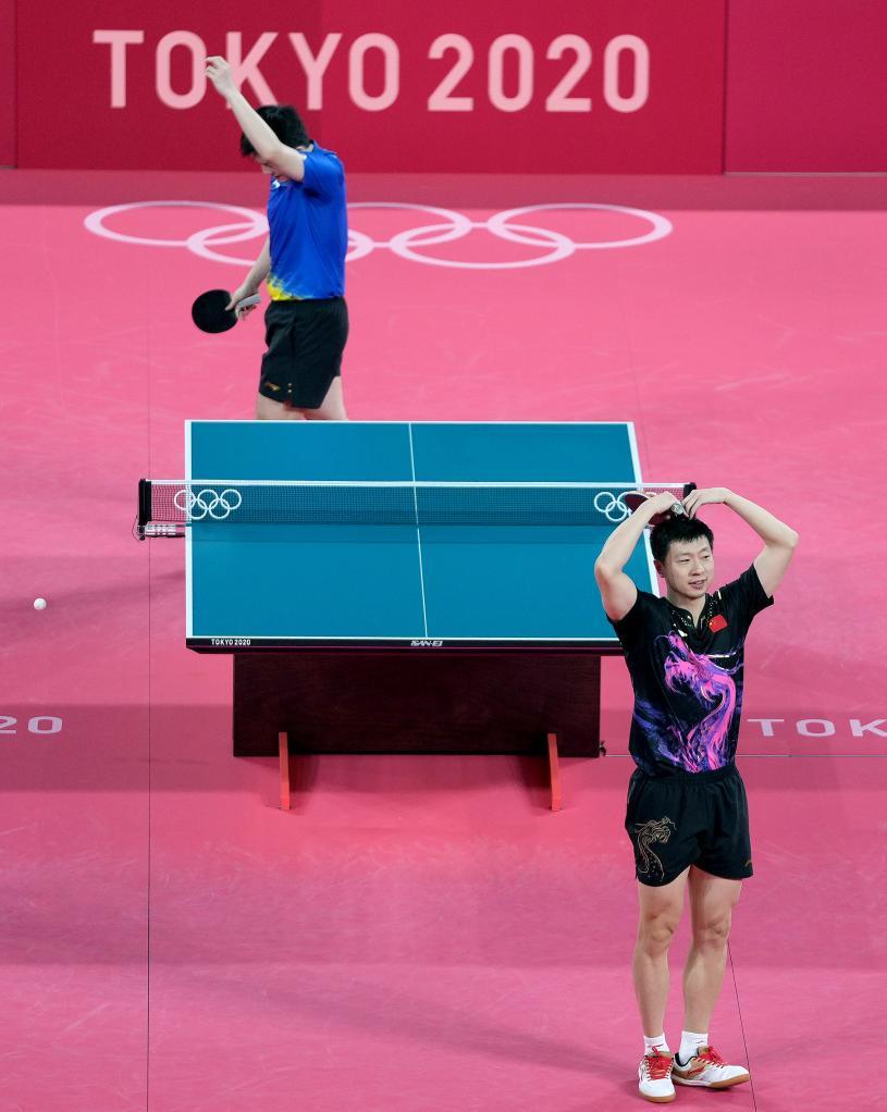 2021年7月30日,在東京奧運會乒乓球男子單打決賽中,馬龍(下)戰勝隊友樊振東,奪得冠軍。新華社記者 王毓國 攝