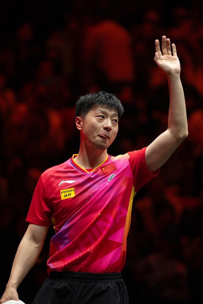 2024年10月6日,馬龍在比賽結束后向球迷揮手致意。當日,在北京舉行的2024年世界乒乓球職業大聯盟(WTT)中國大滿貫男子單打決賽中,中國選手林詩棟4:3戰勝隊友馬龍,奪得冠軍。新華社記者 肖藝九 攝