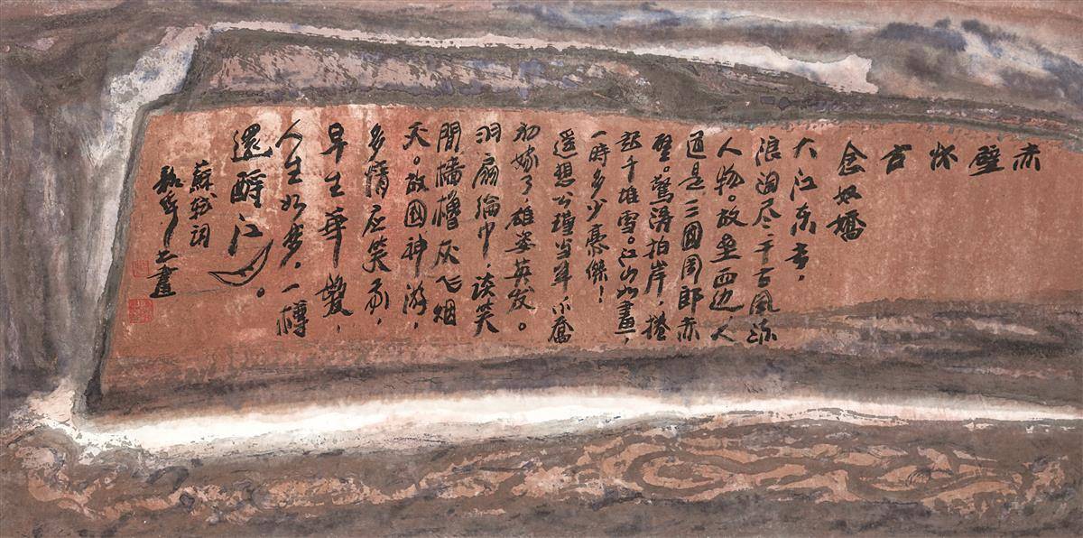 在“長江潮”美術作品展上,他創作《赤壁懷古》參展,并為展覽題寫展名“長江潮”;在“新象長江”美術作品展上,他創作《造化鑄成鐵壁圖》引人注目,他還專門為展覽發來視頻致辭,寄語大家共同努力繁榮長江文化。