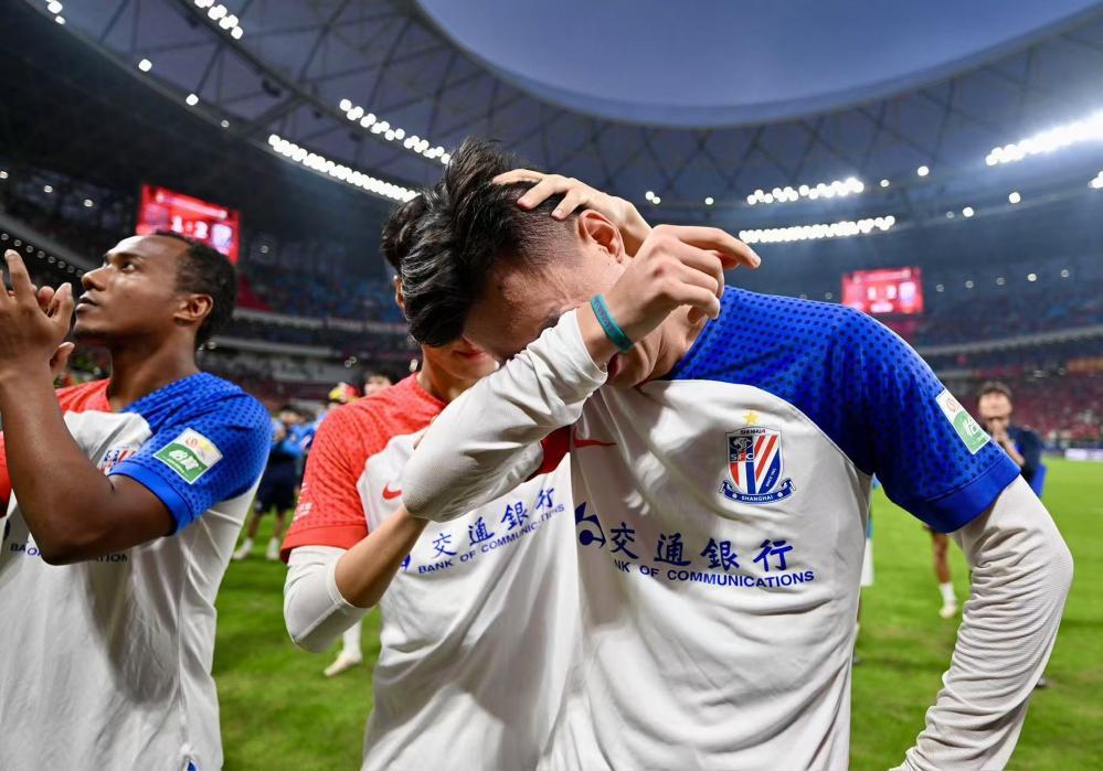 11月2日,上海海港隊(duì)成員在頒獎(jiǎng)儀式上慶祝。新華社記者 賈浩成 攝