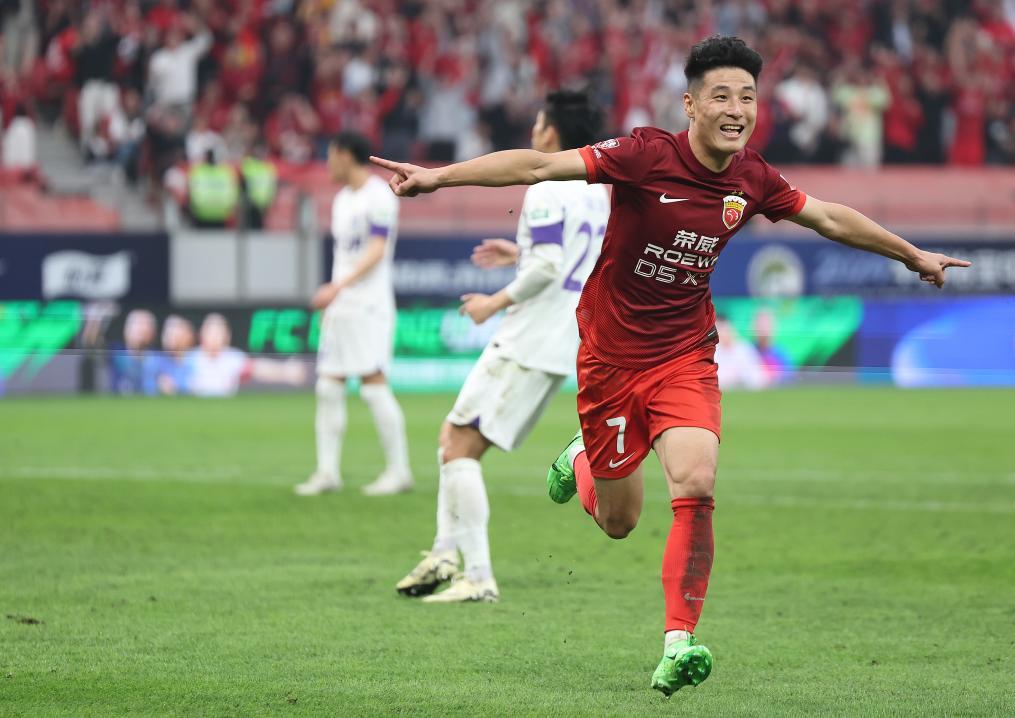 11月2日,上海海港隊(duì)球員武磊進(jìn)球后慶祝。新華社記者 賈浩成 攝