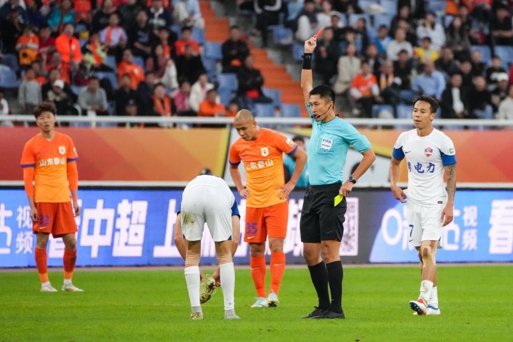 11月2日,本場(chǎng)主裁判馬寧(右二)向梅州客家隊(duì)球員科索維奇出示紅牌。當(dāng)日,山東泰山隊(duì)主場(chǎng)2比1戰(zhàn)勝梅州客家隊(duì)。新華社記者 朱崢 攝
