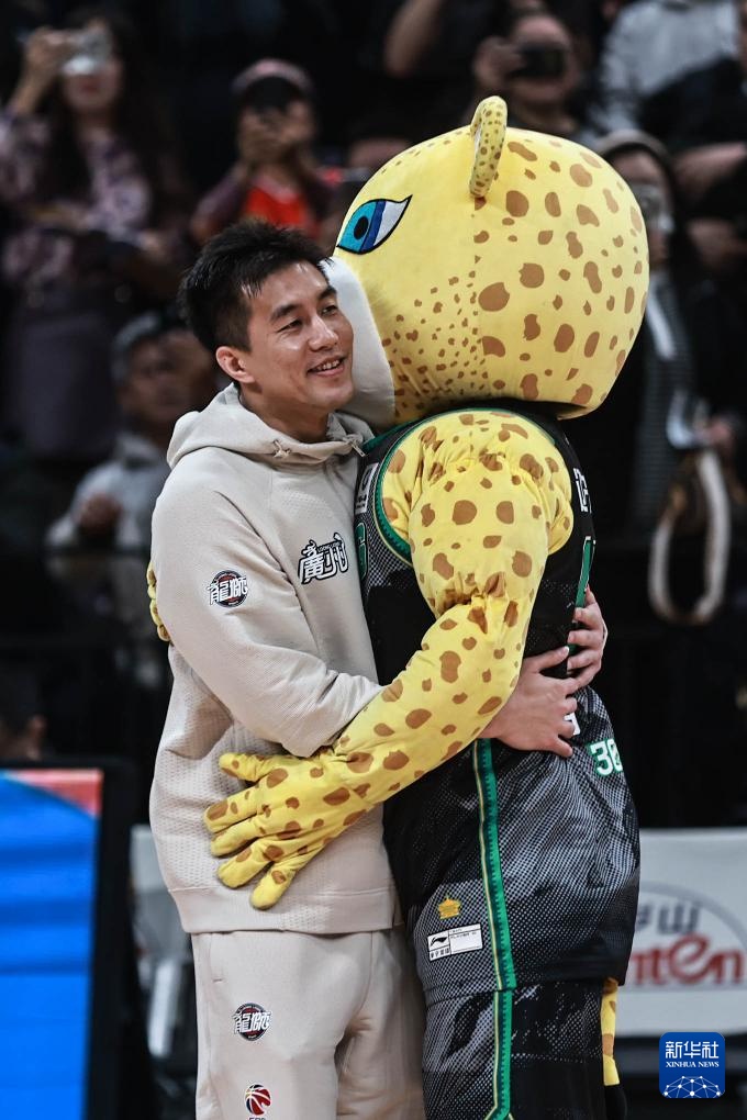 11月3日,廣州朗肽海本隊(duì)球員郭艾倫賽前與遼寧本鋼隊(duì)吉祥物擁抱。