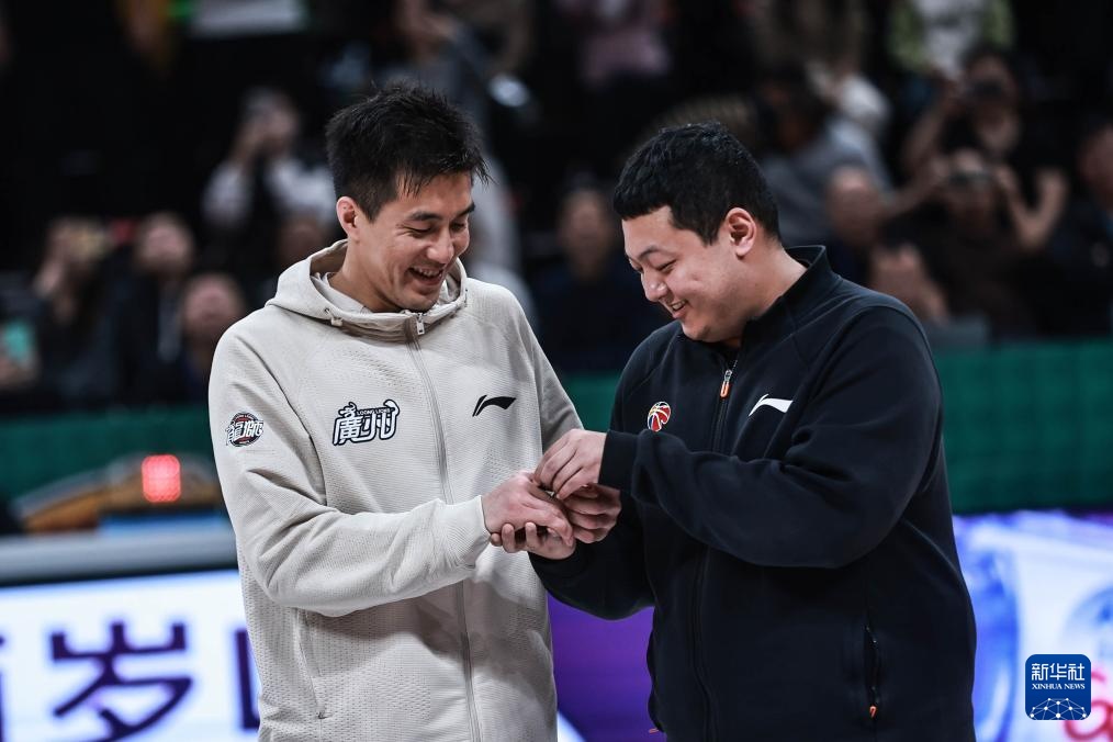 11月3日,廣州朗肽海本隊(duì)球員郭艾倫(右)賽前領(lǐng)取上賽季總冠軍戒指。