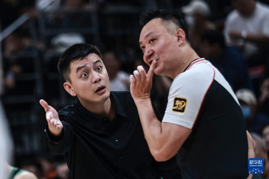 11月3日,遼寧本鋼隊(duì)主教練楊鳴(左)在比賽中與主裁判閆軍交流。