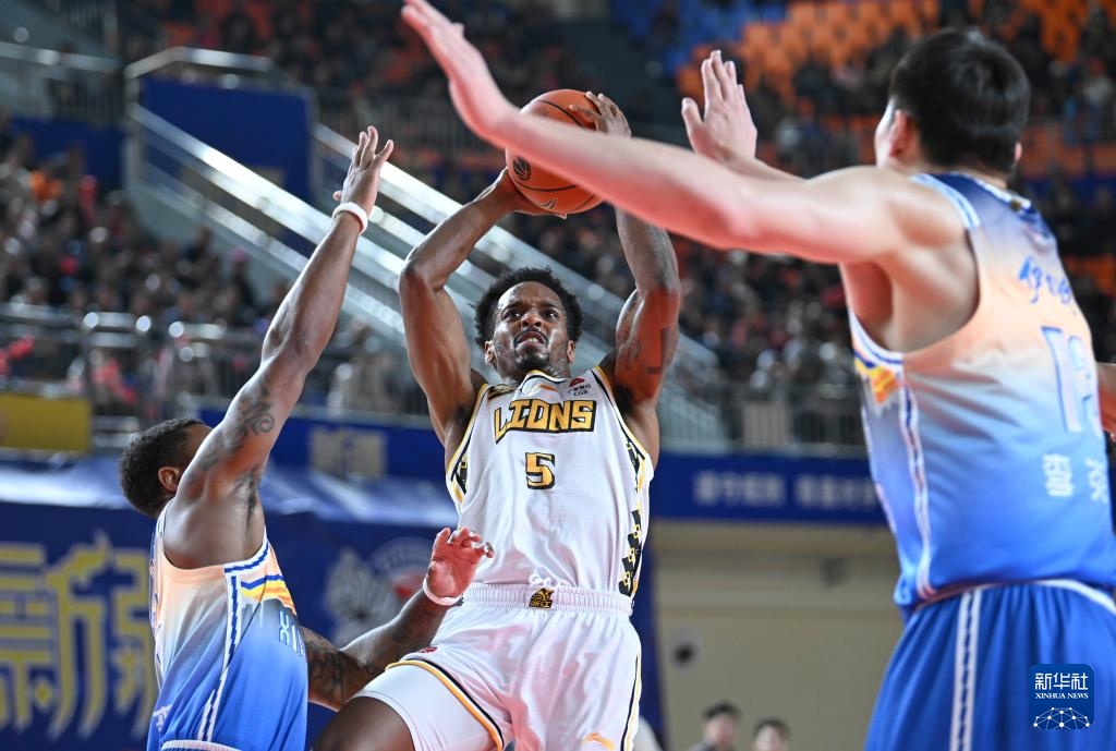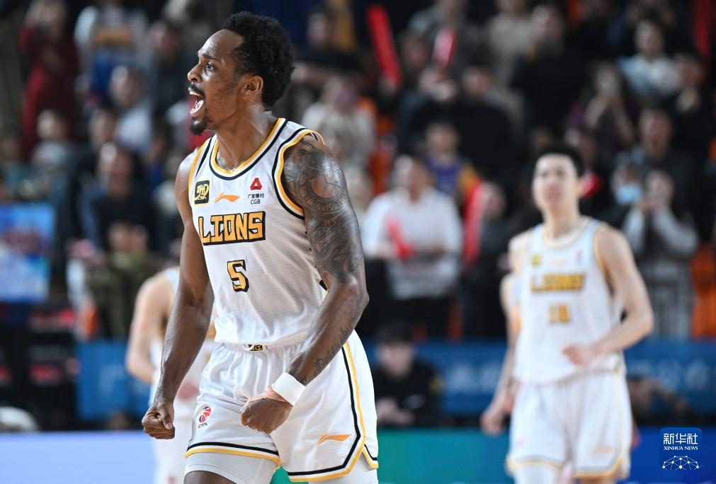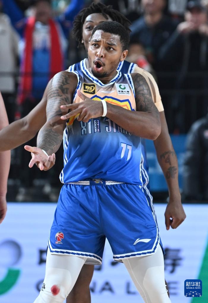 11月3日,新疆伊力特隊球員皮特森在比賽中慶祝關(guān)鍵球得分。