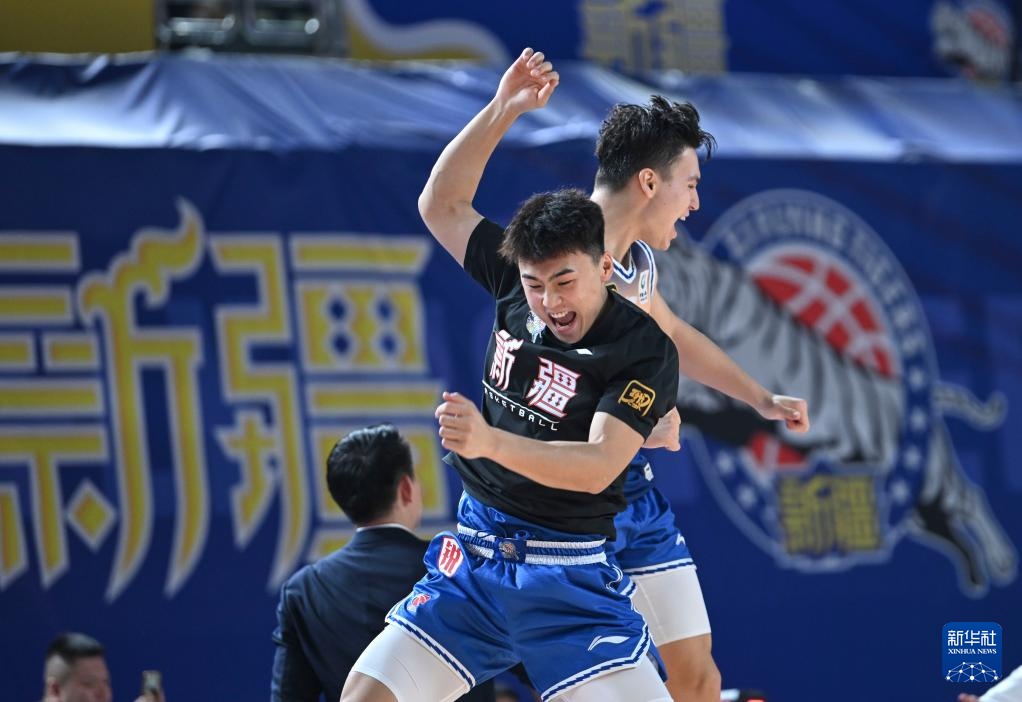 11月3日,新疆伊力特隊球員葛浩然(左)與隊友伊力福拉提在賽后慶祝。
