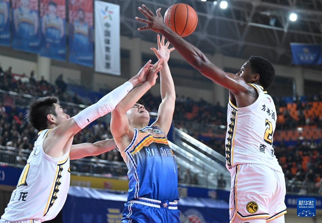 11月3日,新疆伊力特隊球員伊力福拉提(中)在浙江方興渡隊球員奈特(右)、朱俊龍的夾擊防守下投籃。