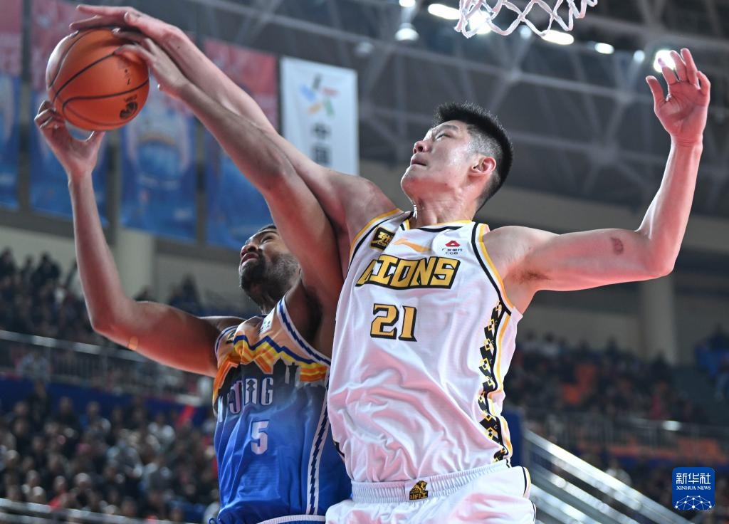 11月3日,新疆伊力特隊球員齊麟(右)突破浙江方興渡隊球員朱俊龍的防守。