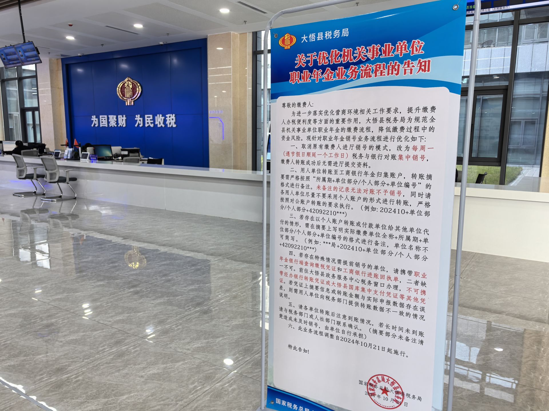 本次優化銷號流程行動,旨在徹底解決職業年金銷號問題,為此大悟縣稅務局把握“當下改”急迫需求和“長久立”綜合考量,在辦稅大廳設立年金銷號專崗,專人專崗應對年金銷號業務,并以繳費人需求為導向,充分考慮“普遍情況”和“特殊個例”兩類情形,為特殊情況下急需銷號的單位提供前臺銷號服務。同時,將此次職業年金優化流程方案制作宣傳易拉寶擺放在辦稅大廳的宣傳區域,對前來辦理職業年金的單位進行宣傳和告知。這些措施的實施,進一步提升了年金銷號的服務質量,增強了繳費人的滿意度。