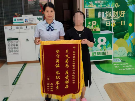 第二天,心有余悸的商戶李女士走進郵儲銀行宜昌市長陽縣榔坪鎮(zhèn)支行,將一面寫有“見義勇為 友愛鄰居 堅守崗位 盡職盡責”的錦旗送到向曉玲的手中,對其表示感謝,也對郵儲銀行盡職盡責友好睦鄰給予充分的認可。